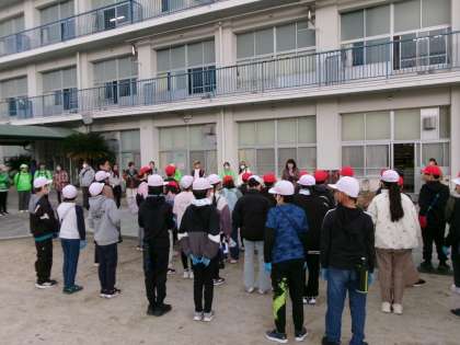 6年生は、地域ボランティアの方と一緒に里山歩きを行いました。普段すぐ近くにある山ですが、今まで知らなかった自然や歴史に触れることができ、新しい発見がたくさんありました。区民会館での出発式では、区長さんから、150年前、古瀬間小学校が始まった場所について説明がありました。そこには、黄葉した大イチョウのあるお寺があり、区民会館から右手に見えました。