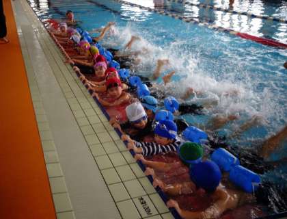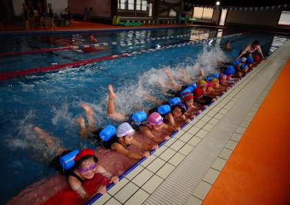 1年生の水泳授業を豊田スイミングスクール美里校で実施しています。ヘルパーや台を使って安心して楽しく練習できるよう、専門のコーチの指導の下で取り組んでいます。
