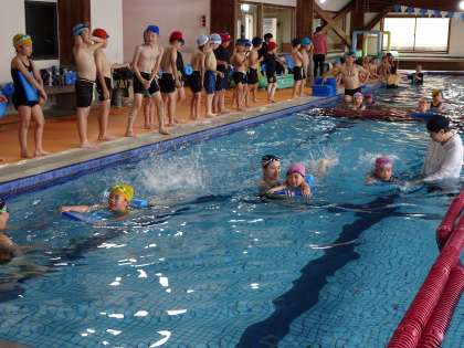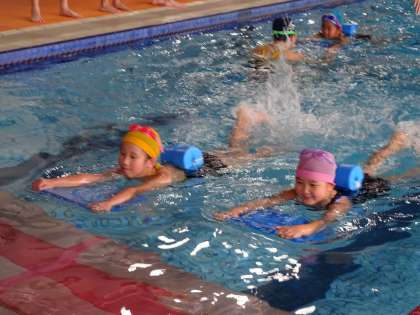 2年生の水泳授業。水慣れの後、一人一人ビート板を使ってバタ足の練習。苦手な子も安心して取り組めるように、コーチと担任が寄り添い励ましの声掛けをしています。子どもたちは、「顔付けができたよ」「ゴールまで泳げたよ」と自分の進歩を感じながら、楽しく取り組んでいます。