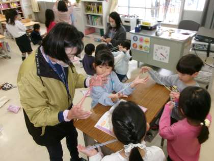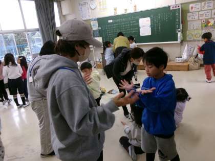 【1年生 昔あそびを名人から教わろうの会(1)】12/3 公開日 2025/12/12 更新日 2025/12/12 各学年から 1年生は、名人の方から昔遊びを教わりました。お手玉、あやとり、けん玉、めんこ、コマなどのやり方についてうまくなるコツを教えてもらい、一生懸命練習しました。