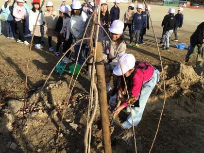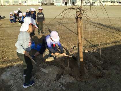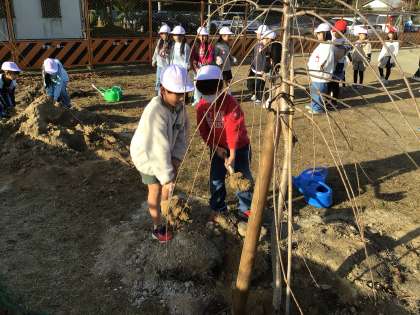 2年生は、学級閉鎖のため延期していた記念植樹を行いました。心を込めて植木に土をかぶせたり、水をかけたりしました。