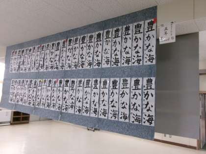 1月7日に行った書き初め大会の作品を集会室で展示しました。どの作品も大切に心をこめて書いたものばかりです。