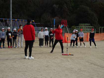 4年生は投げ方教室を行いました。トヨタ自動車野球部の方が講師として来校してくださいました。キャッチボールやTボールをしました。