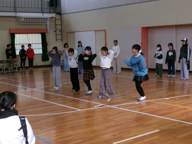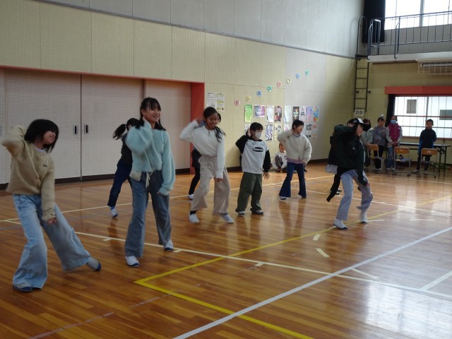 【ダンス・パフォーマンスクラブ発表会】2/6 公開日 2026/02/16 更新日 2026/02/16 特別活動 2月6日学習発表会の当日、長放課にダンスパフォーマンスクラブの発表を行いました。学級閉鎖で参加できなかった5年生がいたため、人数が少なく、残念だったのですが、参観された保護者の前で堂々と発表できました。