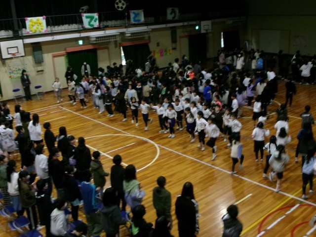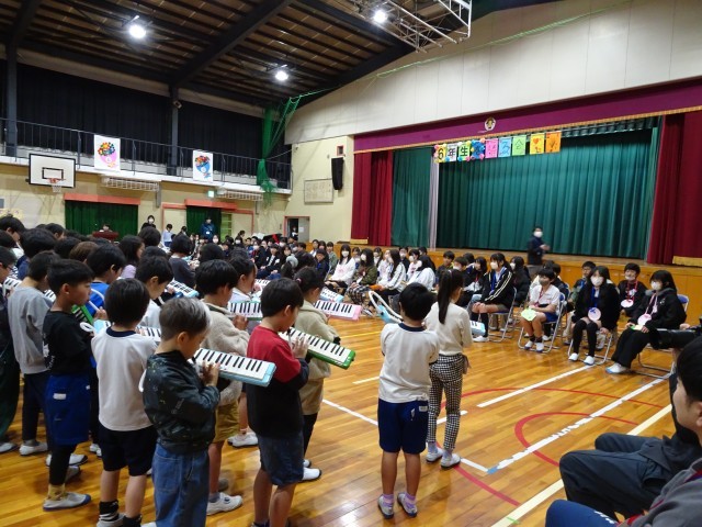 6年生を送る会を行いました。2年生が鍵盤ハーモニカで「校歌」を演奏しました。その後、1・2年生みんなで「ジャンボリーミッキー」を踊りました。6年生も、他の学年も一緒にみんなで楽しく踊りました。