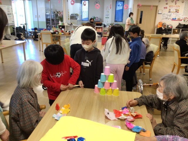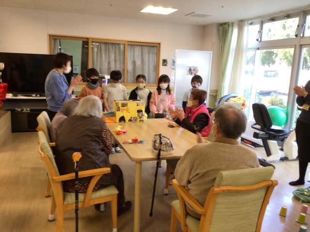 3年生は総合的な学習の時間「やさしさを形に」の学習で、益富の楽園を訪問しました。入所者の方たちに喜んでもらおうと自分たちで考えたおもちゃを使って一緒に楽しいひと時を過ごしました。1組の様子です。