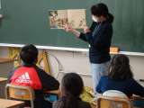 1年生の外国語活動。ALTの先生の話す英語を聞き取ろうと一生懸命耳と目と勘を働か...