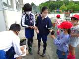 植生ポットに植えたひまわりが10cmくらいに育ち、ボランティアの子どもたちが、英...
