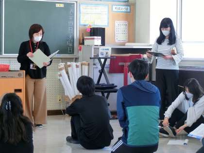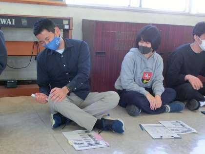 最初に教職員全員が集まって、緊急時対応の具体例を知ったり、シミュレーションの流れをつかんだりしました。また、エピペンの扱い方も実際に行って確認しました。