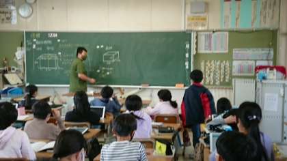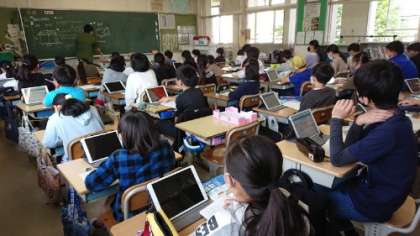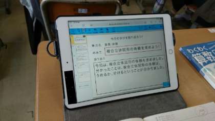 タブレットが使えるようになりました。5年生の算数の授業です。振り返りをタブレットにあるワークシートに入力してあり、授業の最初に振り返りを見てから授業スタートです。机の上にタブレットが乗っている光景が当たり前になります。