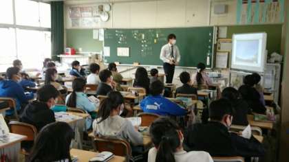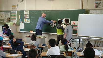 中の写真は4年生の外国語活動の授業です。ALTは昨年度の先生と同じです。