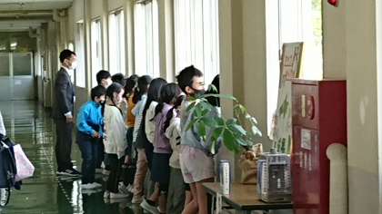 下の写真は3年生の社会の授業です。3階まできて東西南北を確認しています。ちらちらしっかり授業を受けている4年生の授業ものぞいています。