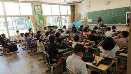 下の写真は3年生の算数の授業の写真です。友達の発言をしつかり聞いています。