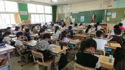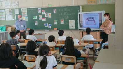 下の写真は4年生の外国語活動の授業の写真です。いろいろな国のあいさつをデジタル教科書の映像を見ながら、英語の発音を聞いています。ALTが子どもたちのペースに合わせて発音もしてくれます。