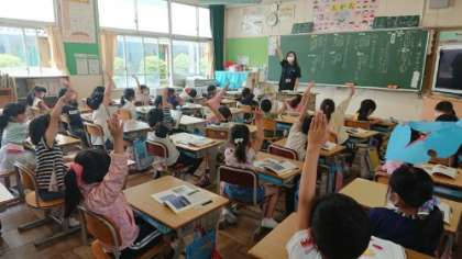 上の写真は1年生の国語の授業です。「さとうとしおの違いを見付けよう」という授業です。海の話になったら、こんなに手があがりました。