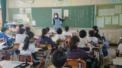 中の写真は5年生の習字の授業です。筆順と形について聞いています。