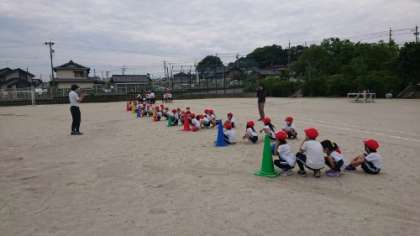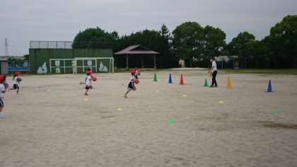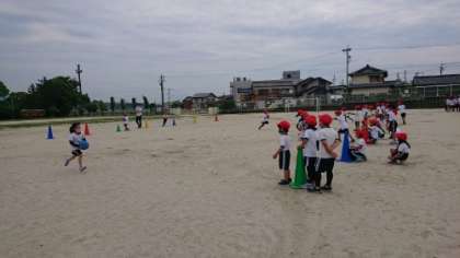 1年生の体育の授業です。ボールをもってまっすぐ走ったり、ジグザグに走ったりして、次の子にボールをわたす競争をしています。遅いと悔しがっていましたが、すぐに次の競争を楽しんでいました。