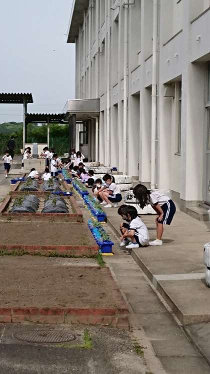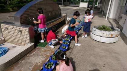 朝、登校して準備ができたら、テラスに出て来て、アサガオに水をやります。「植えた種の数より芽がでてきた数が少ないんだよ」「たくさん葉っぱが出てきたよ」「大きくなったよ」と1年生の子たちが教えてくれます。これからが楽しみです。