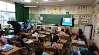 1年生の授業です。タブレットの持ち帰り訓練に向けて、タブレットの操作を学んでいます。