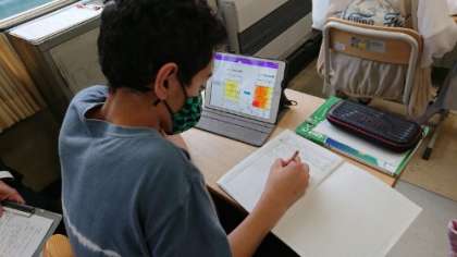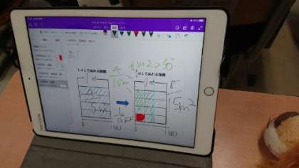 6年の算数の授業です。分数×分数の計算の仕方を面積図を使って考えています。タブレット上で面積図に書き込みながら考えています。