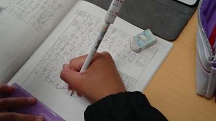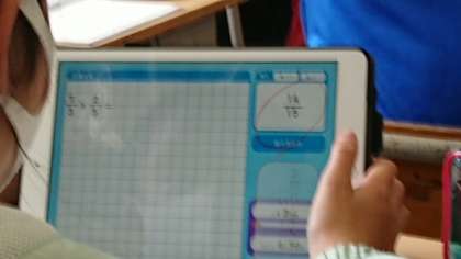 6年生の算数の授業の続きです。授業の最後にタブレットでひまわりボットの問題を解いて練習し、振り返りを書きました。みんなよく手をあげ、意見をしっかり言っていました。