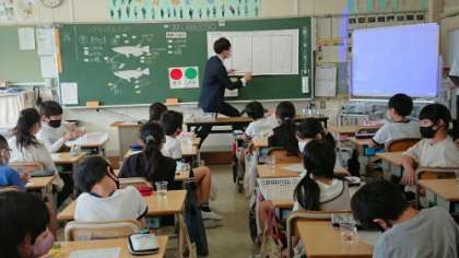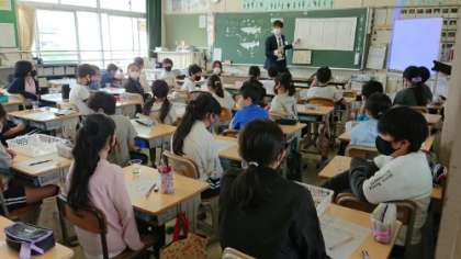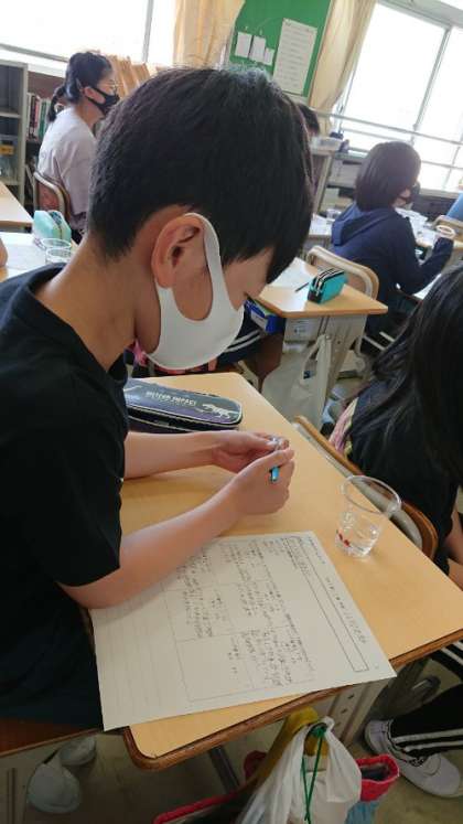 5年生の理科の授業です。メダカのオスとメスの見分け方を学び、実際にメダカを見て見分けていました。