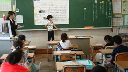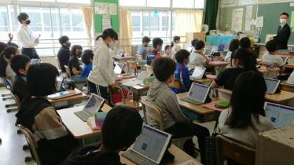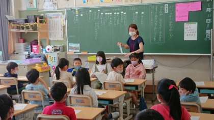 上の写真は2年生の国語の授業です。野菜の様子が伝わる観察カードの書き方を考えました。前に出て、友達に伝えようとしています。
