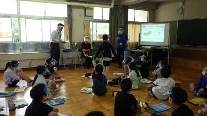 6月2日(水)に上下水道局の方をお招きして社会科の授業で学んでいる下水道について詳しく教えていただきました。下水道の仕組みや流してはいけないものなどを学びました。学習をする中で、ティッシュペーパーとトイレットペーパーを入れたペットボトルを振り、溶け具合を確認しました。すると、ティッシュペーパーが全然溶けていないことに気付きました。そこから、「トイレにティッシュを入れると、トイレが詰まってしまう」と感想を述べました。