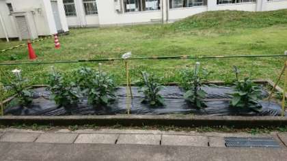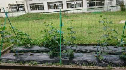 2年生が畑で、なす、きゅうり、トマトを育てています。1年生の時に育てたカブのように大切に育てています。