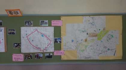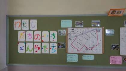 「わたしのまち どんなまち」です。校外学習でわかったことなどが掲示されています。