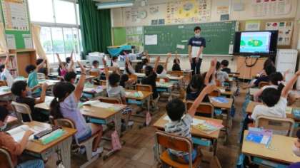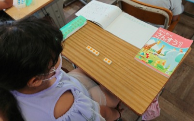 1年生の算数の授業です。数図ブロックをカエルだとして、4匹のカエルが2匹増えたところを表現しています。手もよくあがっています。