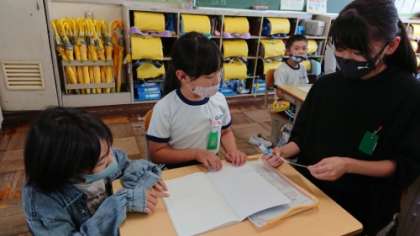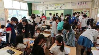 6年生がわくわくタイムの案内を1年生に届けにきてくれました。1年生は6時が連絡帳にはってくれた案内をうれしそうに読んでいました。