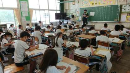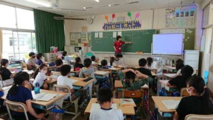 中の写真は2年生の国語の授業です。説明の仕方を覚えようがねらいです。担任が説明し、それにあった絵を子どもたちは書いています。説明が上手ならみんな同じ絵になるかな?