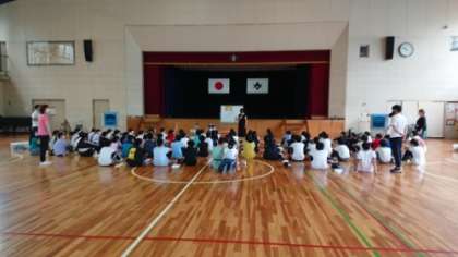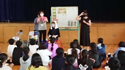 体育館では、高齢者疑似体験をしました。疑似体験の方法を教えていただいています。