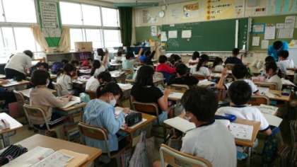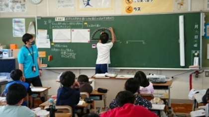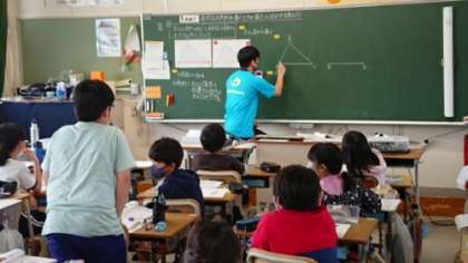 5年生の算数の授業です。TTで行っています。わかっている角度や辺の長さを使って三角形を作図しています。ノートに作図したやり方で黒板に三角形をかいています。それを見ていた子がどうやってかいたのかを説明しています。