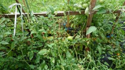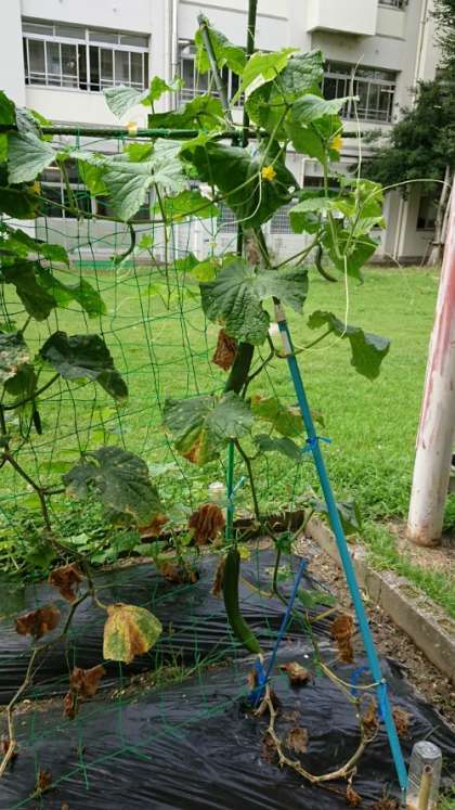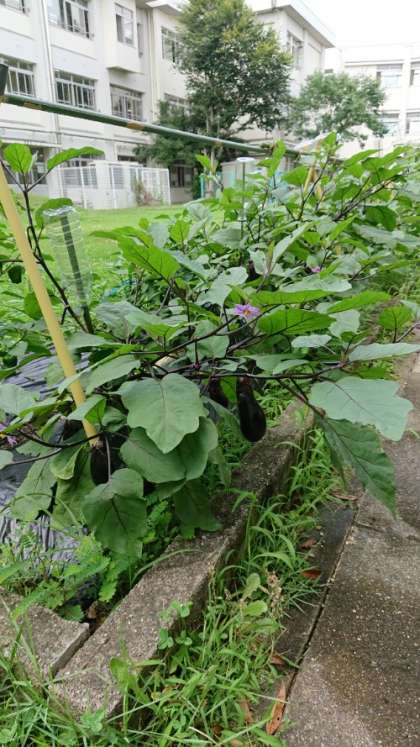 中庭の畑の様子です。なす、きゅうり、トマトができています。