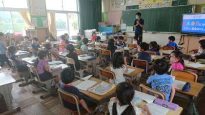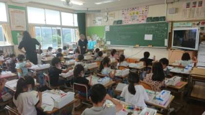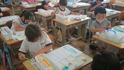 中と下の写真は、「不思議な国のジュースをかこう」がねらいの授業です。容器をなぞった後、色を作って塗っています。