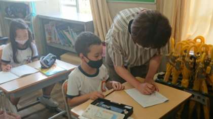 中の写真は2年生の算数の授業です。TTの授業で、担任以外の先生が個別支援をしています。