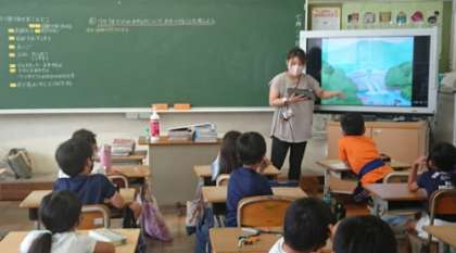 上の写真は1年生の算数の授業です。教科書の絵(電子黒板に写っています)からたし算とひき算の文章題をつくっています。