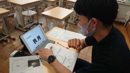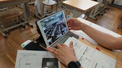 夏休みの宿題などを確認した後で、今までの学級の様子を表す写真を場面共有して振り返りました。その後、クイズをだし、わかった子どもたちが挙手マークを押し、担任が押した子の中から一人を選びました。マイクをオンにして、「きつつき」と答えていました。