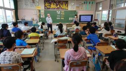 6年生の外国語科の授業です。英語で説明されているオリンピック映像を見ているところです。真剣に見ています。