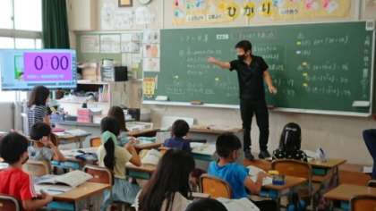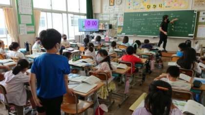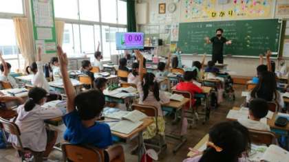 2年生の算数の授業です。「( )を使って計算しよう」がねらいです。手をまっすぐあげている姿が素晴らしいです。