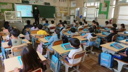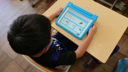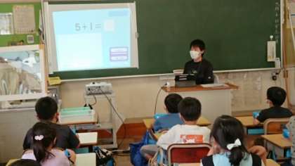 1年生の教室に行くと、担任が操作を説明していました。1年生の子たちはスムーズに操作をしていきます。辿り着いたのは、ひき算の練習問題でした。これで、タブレットで計算練習ができます。