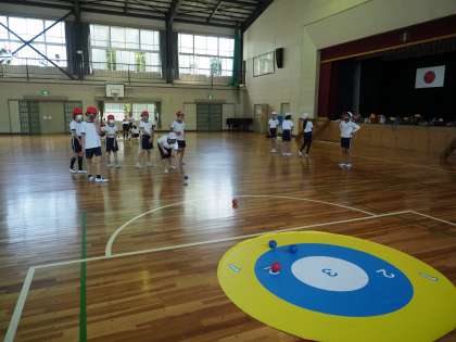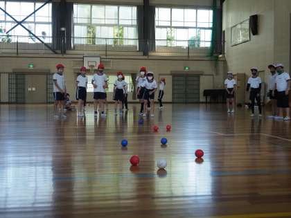 5年生の室内体育では、パラリンピックの種目でもあるボッチャに挑戦しています。