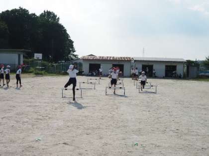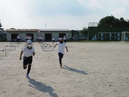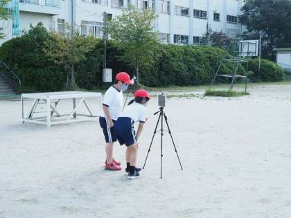 5年生の外体育では、ハードル走を行っています。お手本の動画で、できるポイントを学習し、それを意識しながら練習に取り組んでいます。タブレットのアプリ「遅延ビデオカメラ」を活用し、自分の走っている様子が10秒後に流れるように設定し、フォームチェックを行いながら練習しています。お手本のできるポイントと自分のフォームを比較して少しでもタイムが縮められるように頑張っています。