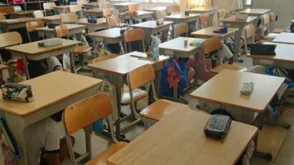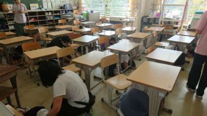 6年4組以外の教室では、机の下に入り気配を消していました。教室はすべて施錠できるようにしたので、施錠しました。不審者はすぐには教室に入れません。教室の外には担任が不審者から子どもたちを守るために待機しています。