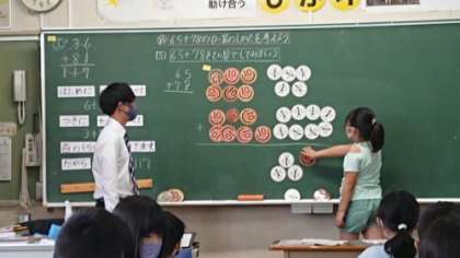 お金を使って繰り上がりについて視覚的に確認した後、筆算だけで、2回繰り上がりのある説明ができるようにしました。練習問題ができた後、説明をノートに一生懸命書いていました。