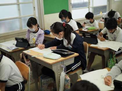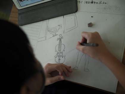 5年生の図画工作科では、読書感想画に取り組んでいます。今年は、「セロ弾きのゴーシュ」で感想画を描いています。子どもたちは、思い思いの場面を想像して、下書きを進めています。人の顔や動物の顔が上手く描けず、何度も描いたり、消したりを繰り返しながら自分の満足のいく作品を仕上げようと頑張って取り組んでいます。