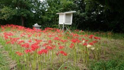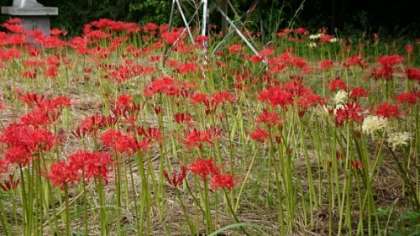 押しボタン式の信号機近くの門で、彼岸花が咲いています。道路から見ることができます。