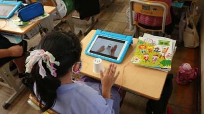 各自のタブレットで、カップス、コップでリズム演奏の練習をしています。